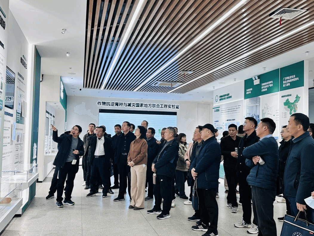 在李培金教授的介绍下,农技人员们依次深入参观了实验室精心打造的两大主题展厅:“抗逆丰产,种芯赋能” 和 “减灾高效,技术引领”。展厅内,前沿的科研成果琳琅满目,涵盖了从作物抗逆功能新基因发掘到智能高效抗逆育种工程技术的全方位展示,让每一位参观者都目不暇接。