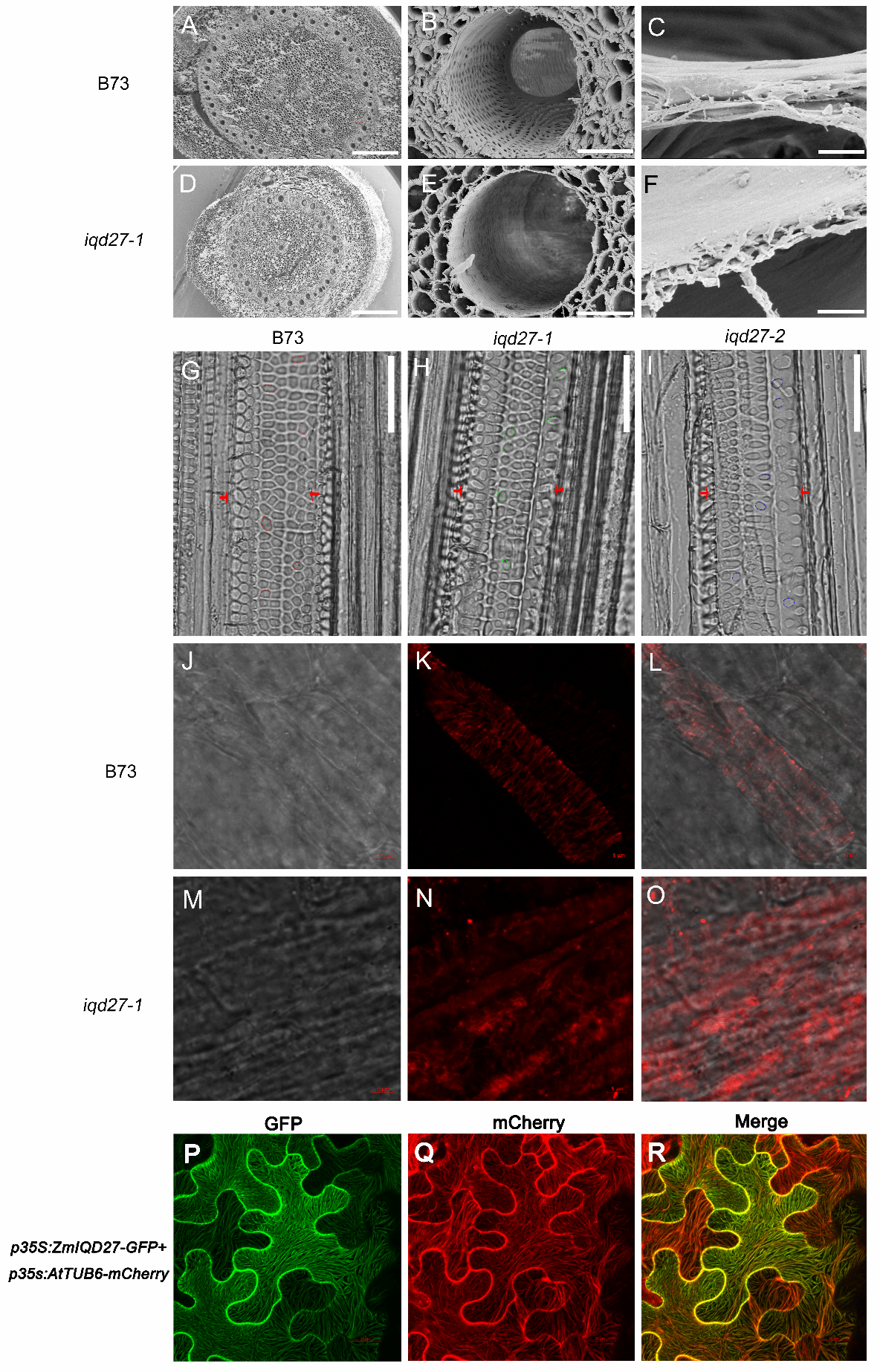 该研究首先从突变体的筛选到一个干旱敏感的玉米突变体,利用Mutmap技术和遗传学分析确定突变基因为ZmIQD27。研究发现ZmIQD27与微管共定位,通过调控微管的排布影响导管次生壁加厚过程。突变体中导管结构的改变影响了水分运输,导致突变体表现对干旱敏感。研究结果丰富了玉米次生壁生物合成的分子调控网络,为分子标记辅助育种提供参考。