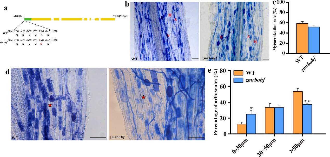 文章通过RNAseq和qRT-PCR结果分析,发现其中一个Rboh基因在接种AM真菌后显著上调表达,可能参与玉米与AM真菌共生过程。随后通过启动子诱导表达实验结果表明其受AM真菌诱导参与调控菌根共生过程(图3)。利用玉米EMS突变体接种AM真菌后分析其表型(图4)。结果发现,菌根共生后期,突变体中大丛枝(>50μm)数量减少,而小丛枝(0-30μm)的数量增多,这一结果表明突变体中丛枝降解速度加快,直接影响共生进程。