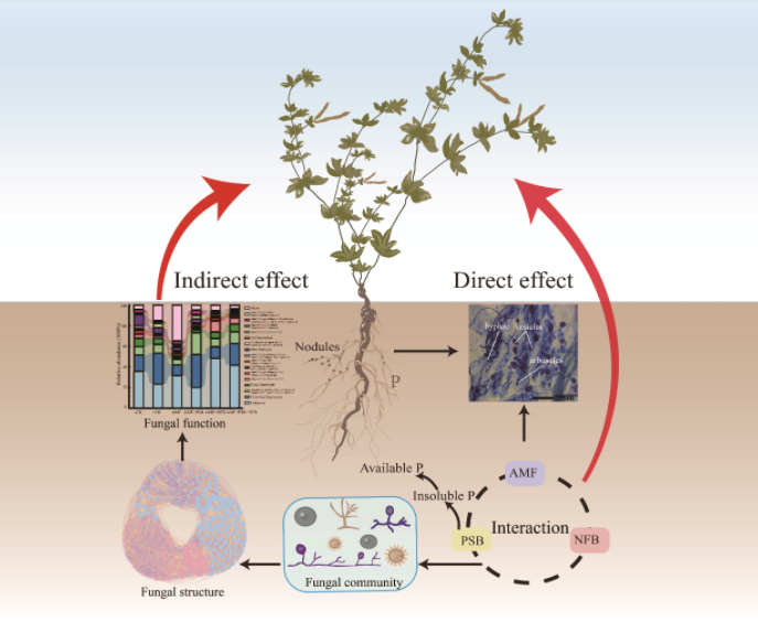 丛枝菌根真菌(AMF)与解磷菌(PSB)、固氮菌(NFB)对植物都有着互惠互利的关系,但它们三者之间的相互作用如何调控植物根际真菌群落,进而促进植物的生长,目前尚未得到系统地研究。本研究通过温室盆栽试验,利Illumina MiSeq高通量测序技术,研究了AMF与细菌(PSB和NFB)的相互作用,探讨了根际真菌群落在百脉根生长中的作用。