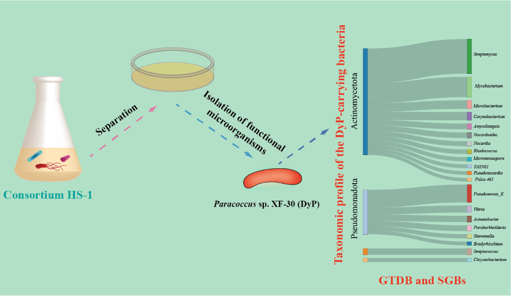 黄曲霉毒素是臭名昭著的霉菌毒素之一,其中黄曲霉毒素B1(AFB1)是最具毒性的。在环境中,微生物在AFB1的生物转化中起着至关重要的作用。在本研究中,获得了一个能够降解和解毒AFB1的细菌群落HS-1。本研究结合了多组学和基于培养的技术来阐明群落HS-1对AFB1的生物转化机制。宏基因组学分析表明,主要属于变形菌门和放线菌门的多种微生物携带参与AFB1生物转化初始步骤的关键功能酶。宏转录组学分析表明,副球菌属相关细菌在群落HS-1中最为活跃。从群落HS-1中分离出了一株新的AFB1降解细菌Paracoccus sp. strain XF-30,并表征了菌株XF-30中催化AFB1初始代谢的新型染料脱色过氧化物酶(DyP)。生物信息学分析表明,参与AFB1初始生物转化的DyP微生物广泛分布在各种环境中,主要与变形菌门和放线菌门有关。对群落HS-1中AFB1生物转化的深入研究将有助于我们更科学、更有效地探索这些关键的微生物资源。