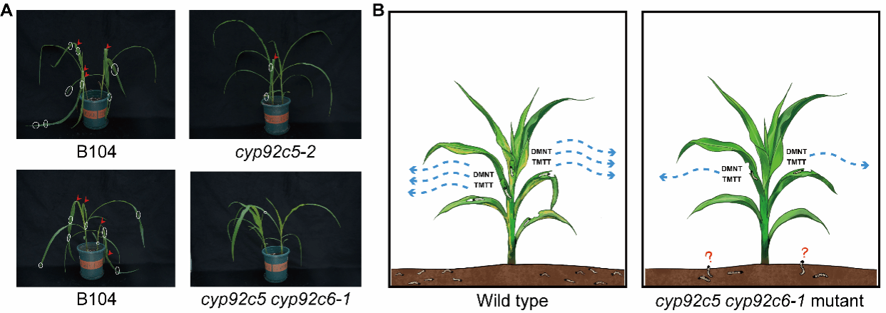 图1 cyp92c6/cyp92c5突变体使玉米对亚洲玉米螟幼虫的吸引力下降