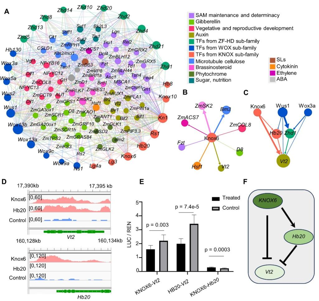 该研究从玉米自交系B73中收集了46个转录组和16个翻译组数据集,结合tsCUT&Tag、ATAC-seq和机器学习模型,成功绘制了SAM关键homeobox TFs的基因调控网络,全面系统解析了homeobox TFs调控株高功能基因的分子机制。该调控网络为深入系统剖析控制玉米SAM生长发育和株型形态建成的潜在分子机制提供了可能。