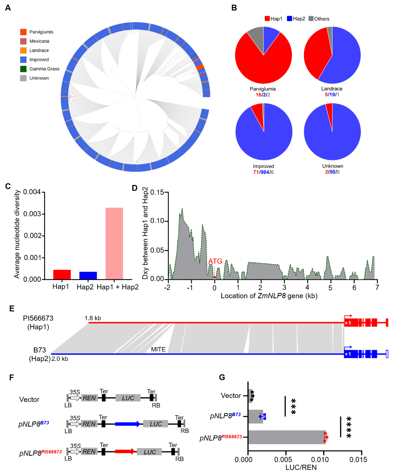 前期研究表明,NLP(NIN-like Protein)类型转录因子是调控植物氮素利用效率的关键分子开关。研究团队通过筛选玉米EMS突变体库、创制ZmNLP8基因过量表达与基因编辑转基因株系,并经过多年多点田间试验和水培实验,明确了ZmNLP8基因调控玉米氮素利用效率的生物学功能。体内体外蛋白互作实验证实ZmNLP8与ZmTCP8互作,并协同激活ZmNiR1.2基因表达。进一步分析ZmNLP8基因在1210份玉米材料(HapMap3)中序列多态性,发现ZmNLP8基因编码区非常保守,而启动子区域富含多种变异类型。在玉米野生种和近缘种中主要存在形式是ZmNLP8Hap1单倍体型,而在现代玉米中则广泛存在ZmNLP8Hap2单倍体型,且ZmNLP8Hap2启动子区域包含一个201 bp的微型反向重复转座元件(MITE),该插入元件显著降低了ZmNLP8基因的转录激活能力。