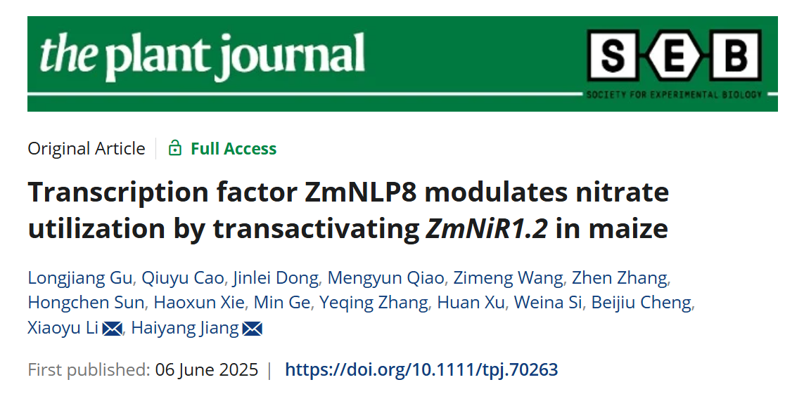 本网讯 近日,我院作物抗逆育种与减灾国家地方联合工程实验室江海洋、顾龙江团队在生物学权威期刊《The Plant Journal》在线发表了题为“Transcription factor ZmNLP8 modulates nitrate utilization by transactivating ZmNiR1.2 in maize”的研究论文,初步揭示了玉米ZmNLP8基因调控玉米氮素利用的分子机制。