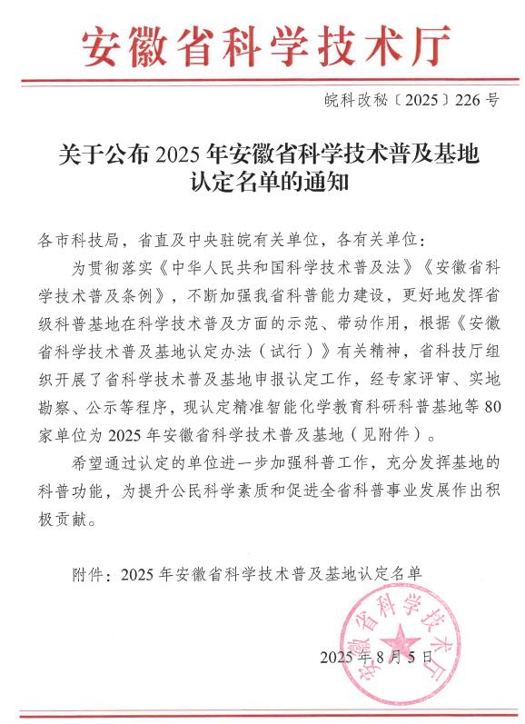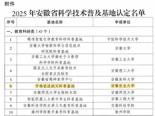 本网讯 近日,安徽省科学技术厅印发《关于公布 2025 年安徽省科学技术普及基地认定名单的通知》(皖科改秘〔2025〕226 号),我室作物抗逆育种科普基地顺利通过评审,成功入选2025年安徽省科学技术普及基地。